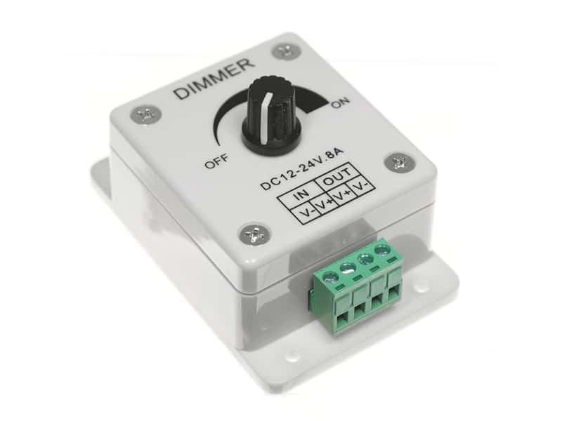 Kompakt 12–24V DC LED-dimmer med dreieknapp som kan håndtere opptil 8A.
